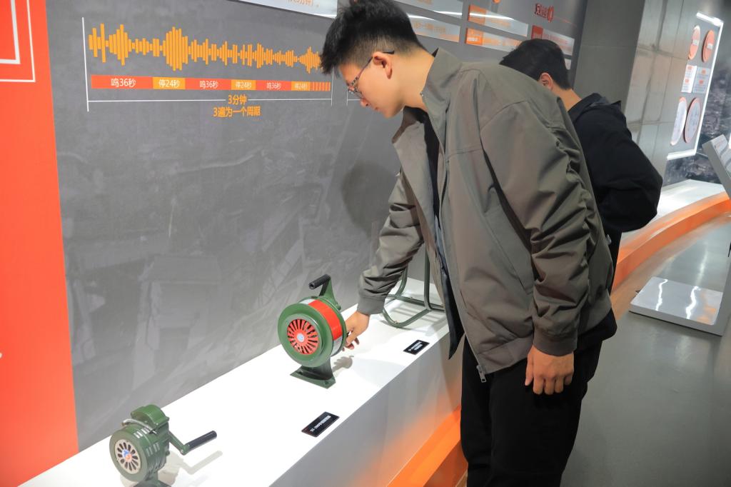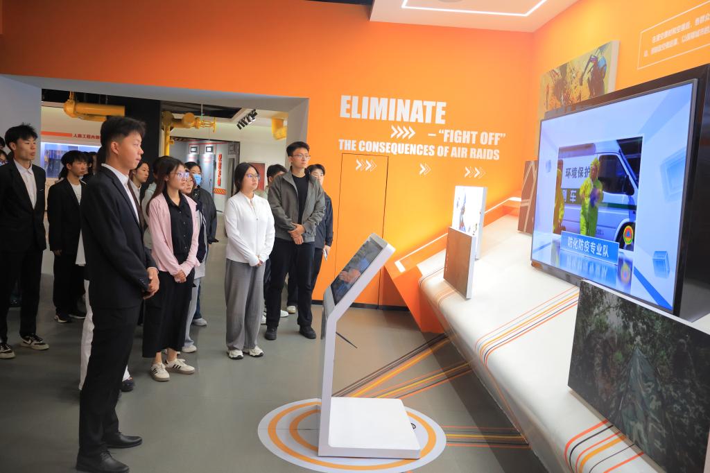 在宣教馆参观过程中,师生通过实物模型、历史图片、多媒体演示等多元化展示形式,系统学习了国防安全知识、人民防空发展历程及现代战争防护技能。大家专注聆听讲解,仔细观摩防空洞实体模型等展品,对比人防历史影像资料与现代化防护装备的鲜明差异,深刻认识到国家安全体系的时代演变,体悟“国无防不立”的深刻内涵。特别是在战时人民防空实景模拟环节,逼真的空袭警报识别与疏散演练将抽象的国家安全概念转化为具象行动认知。转入互动体验区后,师生通过沉浸式模拟防空警报响应、战时隐蔽疏散等场景,进一步强化了国防安全意识和应急反应能力。