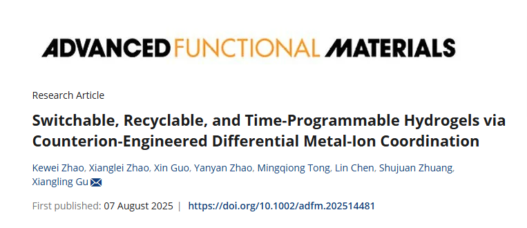 近日,太阳成官网与山东理工大学联合培养硕士研究生赵可伟(导师:顾相伶教授),作为第一作者,以122cc太阳集成为第一完成单位在材料类Top期刊《Advanced Functional Materials》发表最新研究成果:基于抗衡离子调控策略开发出集功能切换、绿色回收与动态加密于一体的多功能水凝胶。