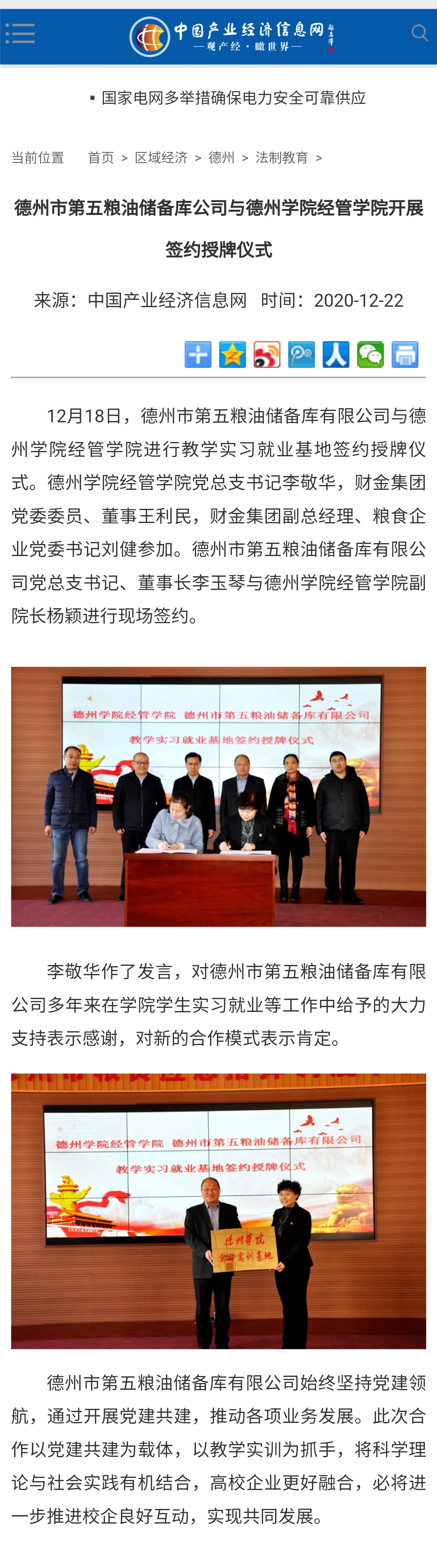 【中国产业经济信息网】德州市第五粮油储备库公司与122cc太阳集成经管学院开展签约授牌仪式