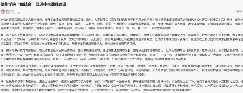 练:课内与课外练习有序整合。在发挥课堂教学主阵地的同时,强化课后课外练习,通过布置课后锻炼作业,强化学生的体育锻炼行为,让学生在课后进行身体素质、运动技战术、战术配合的练习,为大三大四学生开设了20余门体育俱乐部课程,成了体育活动指导中心统一管理运动项目俱乐部和指导全校的课外体育活动,开展了“一院一品”体育活动创建工作,借助校级“大体育”实践平台积极组织大学生参加体育赛事和社区的志愿服务,开展了“大手拉大手”活动,与德州市5所初中、12所小学建立了合作关系,指导青少年体质健康的促进与提升。