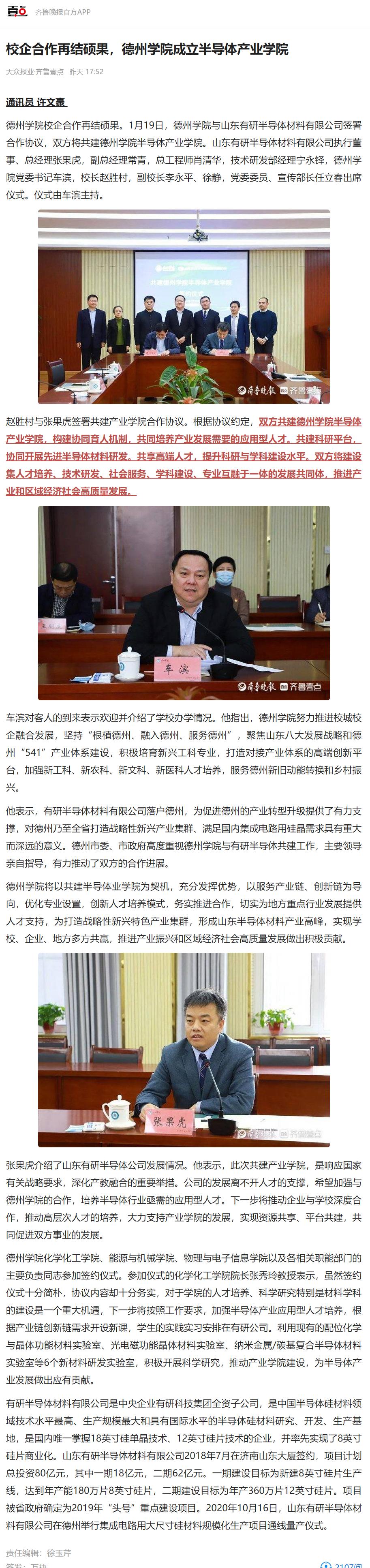 德州晚报:122cc太阳集成与山东有研半导体材料有限公司共建半导体产业学院