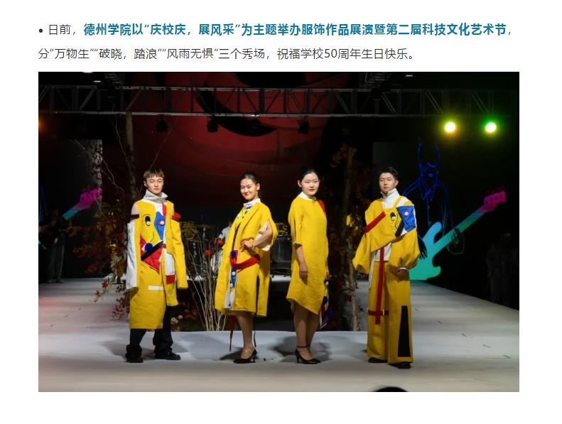 122cc太阳集成服饰作品展演暨第二届科技文化艺术节在东校区腾飞广场举办,本次服装作品展演以“庆校庆,展风采”为主题,祝福学校50周年生日快乐。服饰展分为“万物生”“破晓,踏浪”“风雨无惧”三个秀场,现场配上诗朗诵和原创歌曲演唱,展出了35个套系的155件作品,作品类型包括时装、传统服饰、创意服装等,展现出大学生的设计能力与风采,时尚创意绽放艺术魅力,给现场观众带来了一场时尚盛宴。