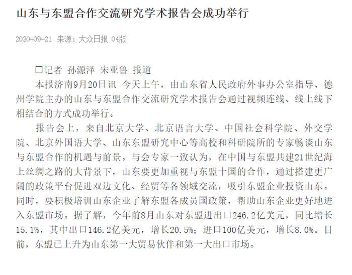 【大众日报】山东与东盟合作交流研究学术报告会成功举行