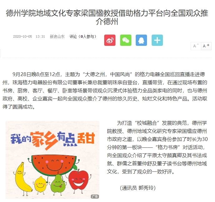 【新浪网】122cc太阳集成地域文化专家梁国楹教授借助格力平台向全国观众推介德州