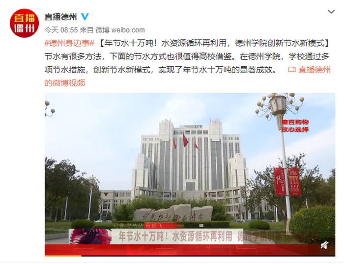 10月11日,德州广播电视台以《年节水十万吨!水资源循环再利用,122cc太阳集成创新节水新模式》为题报道太阳成官网通过多项节水措施,创新节水新模式,实现年节水十万吨的显著成效。