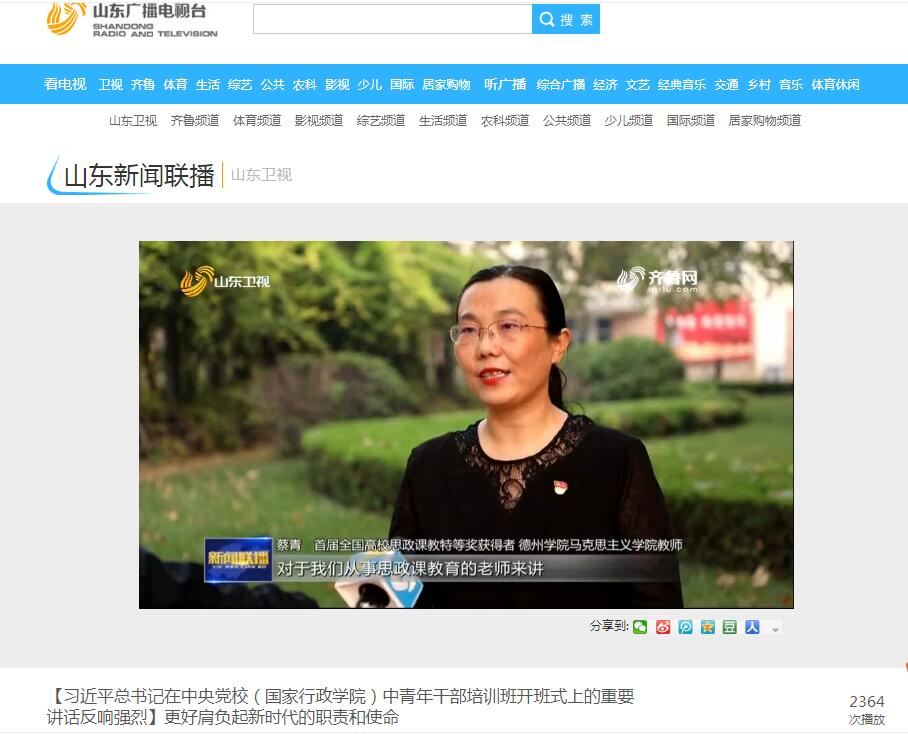 习近平总书记在2020年秋季学期中央党校(国家行政学院)中青年干部培训班开班式上发表的重要讲话。10月11日,央视网、山东新闻联播选取了不同代表热议习近平总书记在中青年干部培训班开班式上发表的重要讲话,其中首届全国高校思政课教特等奖获得者,122cc太阳集成马克思主义学院教师蔡青作了代表发言,她表示,对我们从事思政课教育的老师来讲,思政课是触及青年学生灵魂的工作,当前要打好思政课质量提升攻坚战,推动教学方法改革创新,引导大学生深度参与思政课教学,使思政课有全新的“打开方式”,使学生真正的乐意学、学得进、学得好,真正让思政课的“灵魂”理论入脑入心。央视网、山东新闻联播对此进行报道。