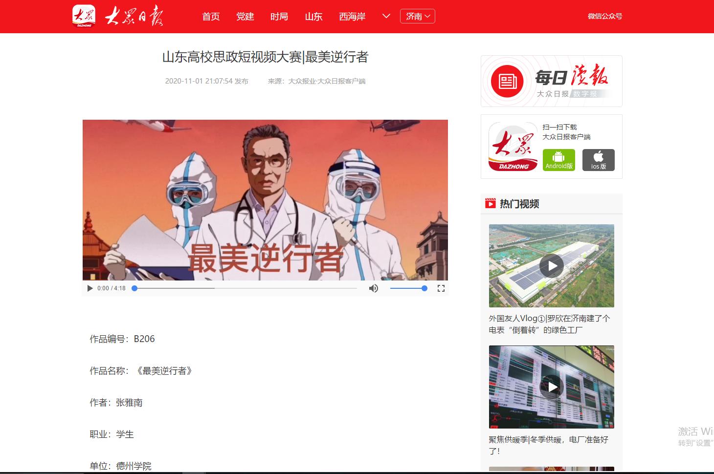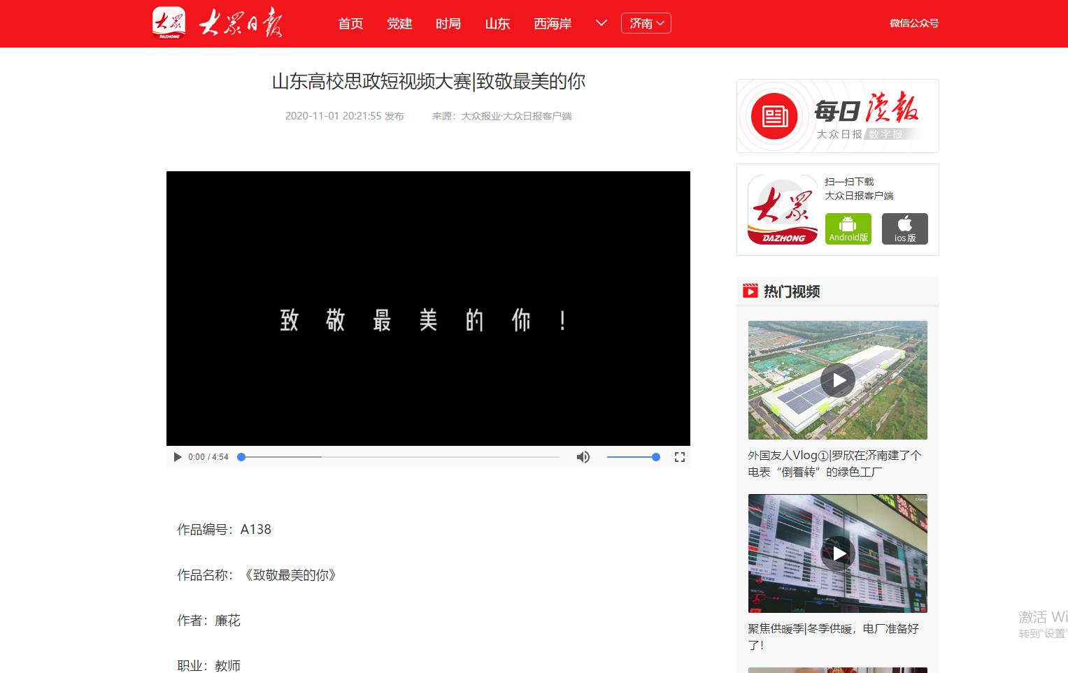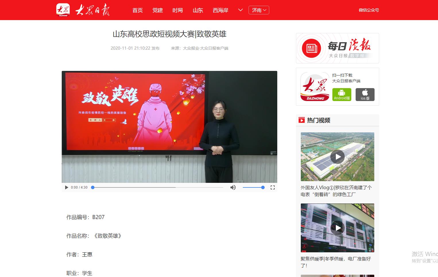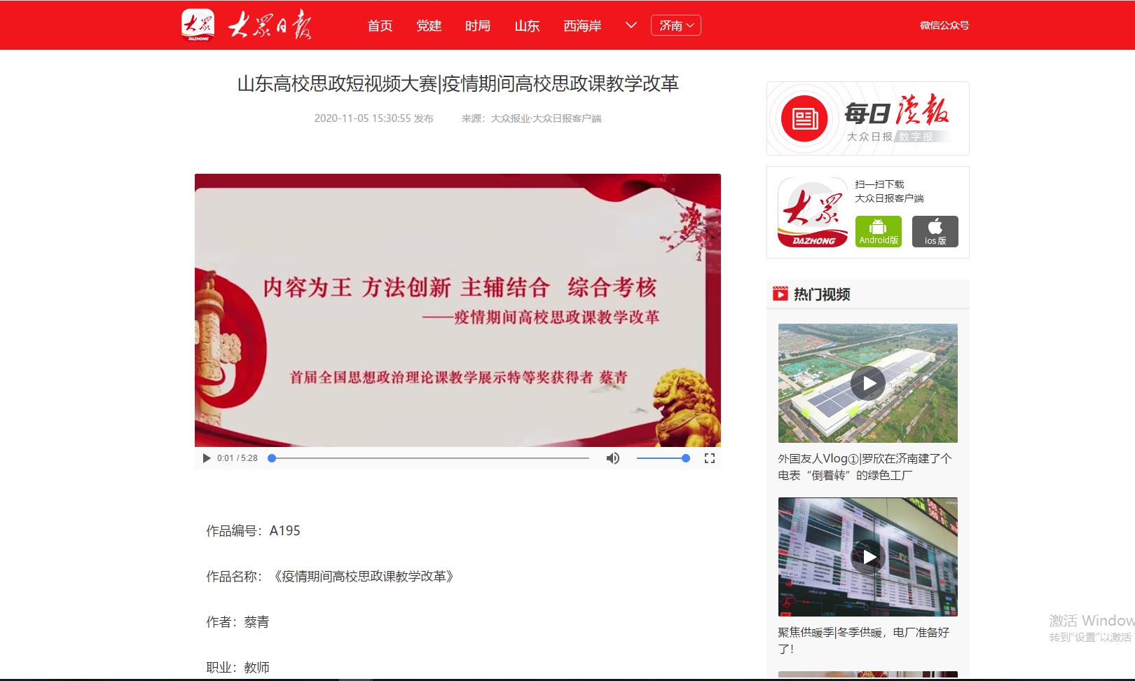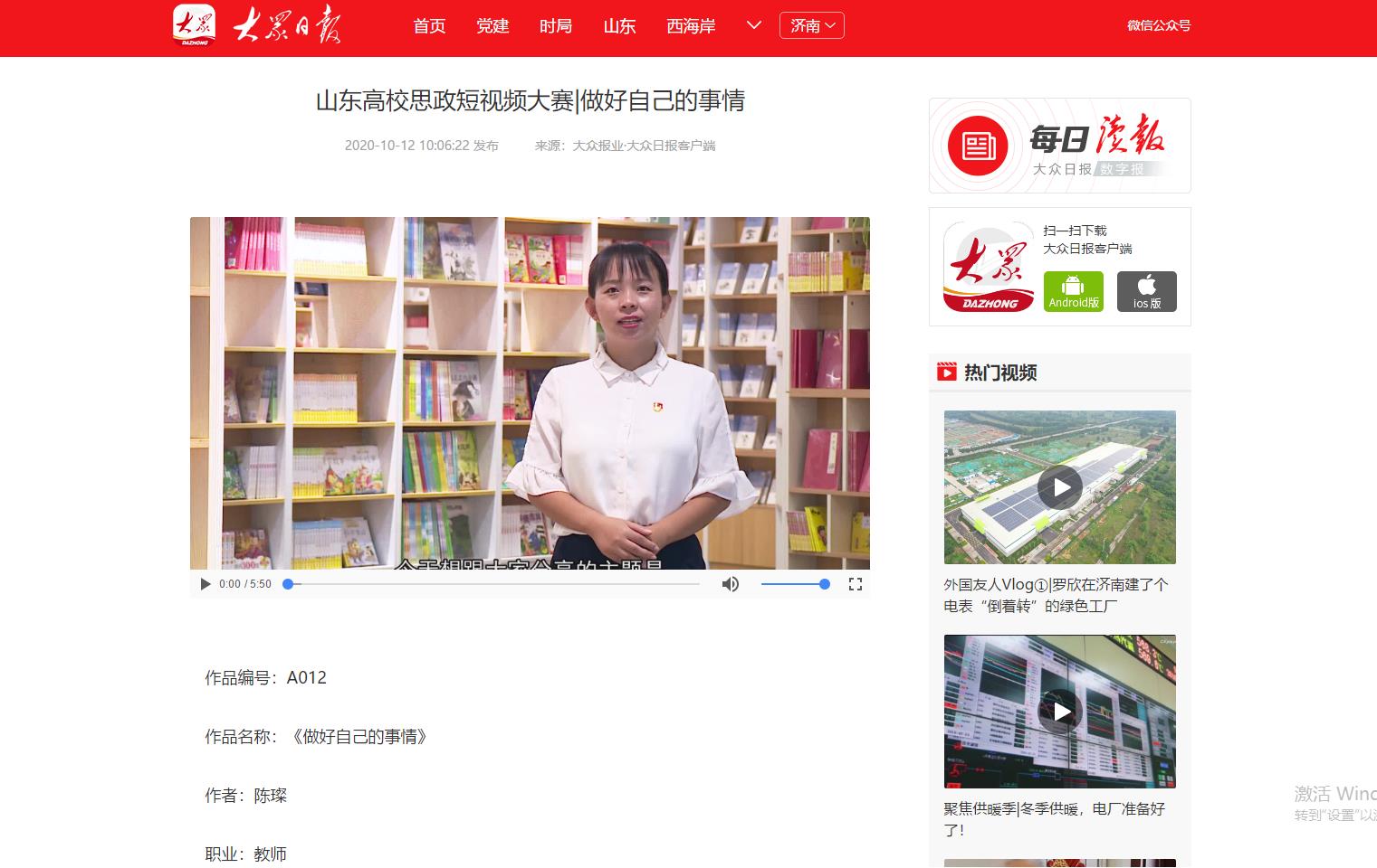 为深入学习贯彻习近平总书记在学校思想政治理论课教师座谈会上的重要讲话精神,展示山东高校思政课改革创新成果,促进高校思政工作和思政课教学增强活力,大众日报、山东省教育厅、山东省广播电视局联合主办山东省首届高校思政短视频大赛。太阳成官网党委宣传部、团委积极发动师生投稿,最终蔡青、陈璨、廉花入围教师组,张雅南、王惠入围学生组。