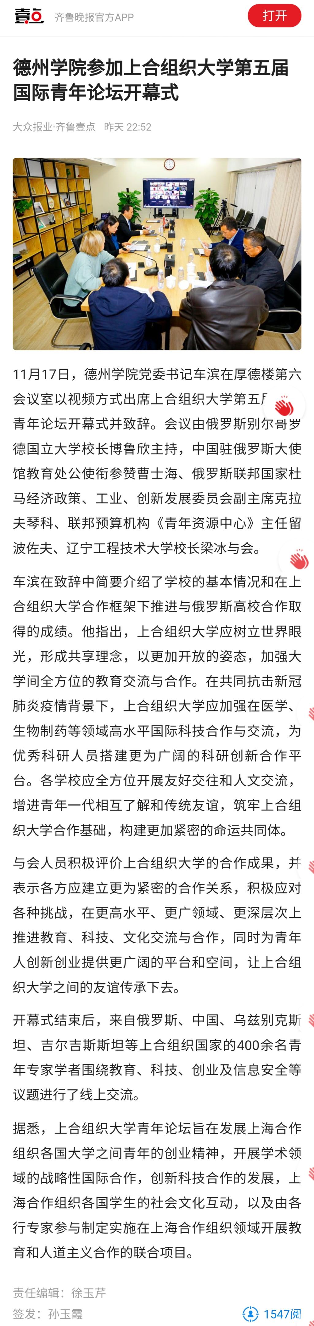 【齐鲁壹点】122cc太阳集成参加上合组织大学第五届国际青年论坛开幕式