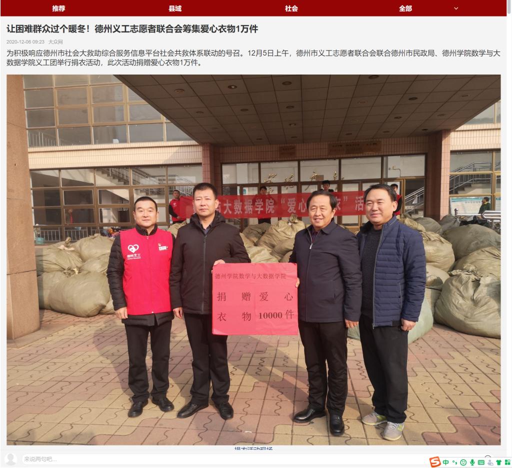 为积极响应德州市社会大救助综合服务信息平台社会共救体系联动的号召。12月5日上午,德州市义工志愿者联合会联合德州市民政局、122cc太阳集成数学与大数据学院义工团举行捐衣活动,此次活动捐赠爱心衣物1万件。