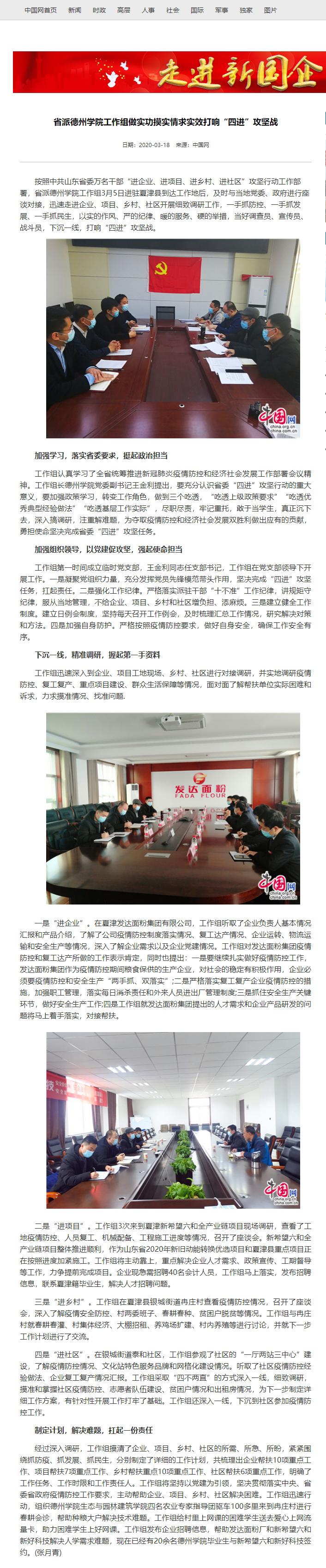 按照中共山东省委万名干部“进企业、进项目、进乡村、进社区”攻坚行动工作部署,省派122cc太阳集成工作组3月5日进驻夏津县到达工作地后,及时与当地党委、政府进行座谈对接,迅速走进企业、项目、乡村、社区开展细致调研工作,一手抓防控、一手抓发展、一手抓民生,以实的作风、严的纪律、暖的服务、硬的举措,当好调查员、宣传员、战斗员,下沉一线,打响“四进”攻坚战。中国网以“省派122cc太阳集成工作组做实功摸实情求实效打响“四进”攻坚战”为题对此进行了报道。