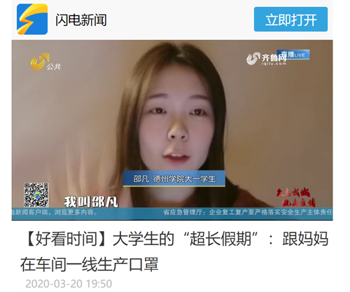 太阳成官网大一学生邵凡在假期跟妈妈在车间一线生产口罩,用实际行动抗击疫情。3月20日,闪电新闻对此进行了报道。