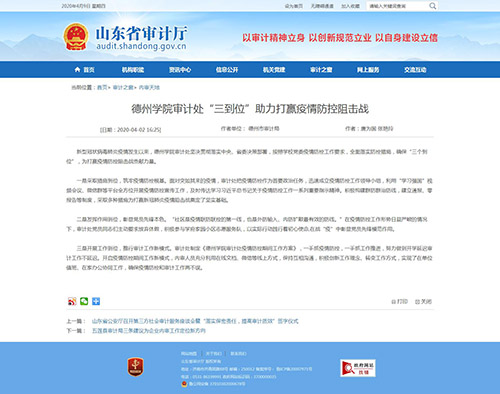 4月2日,山东省审计厅网站,审计之窗栏目以《122cc太阳集成审计处“三到位”助力打赢疫情防控阻击战》为题对太阳成官网审计工作进行报道。
