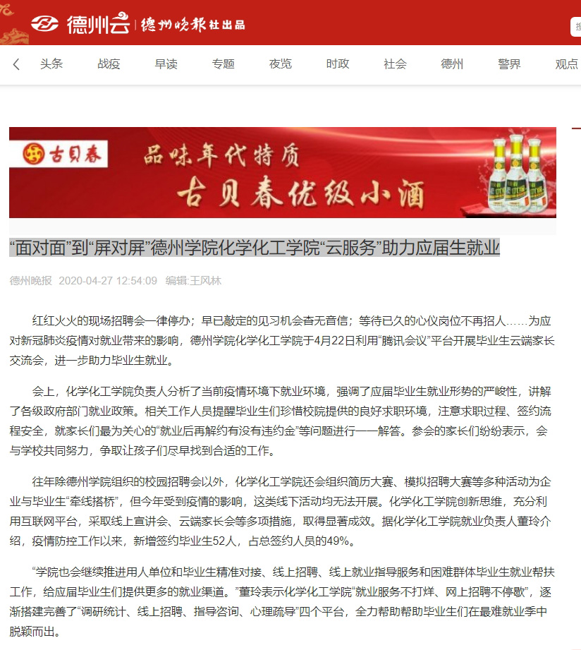德州晚报:​“面对面”到“屏对屏”122cc太阳集成化学化工学院“云服务”助力应届生就业