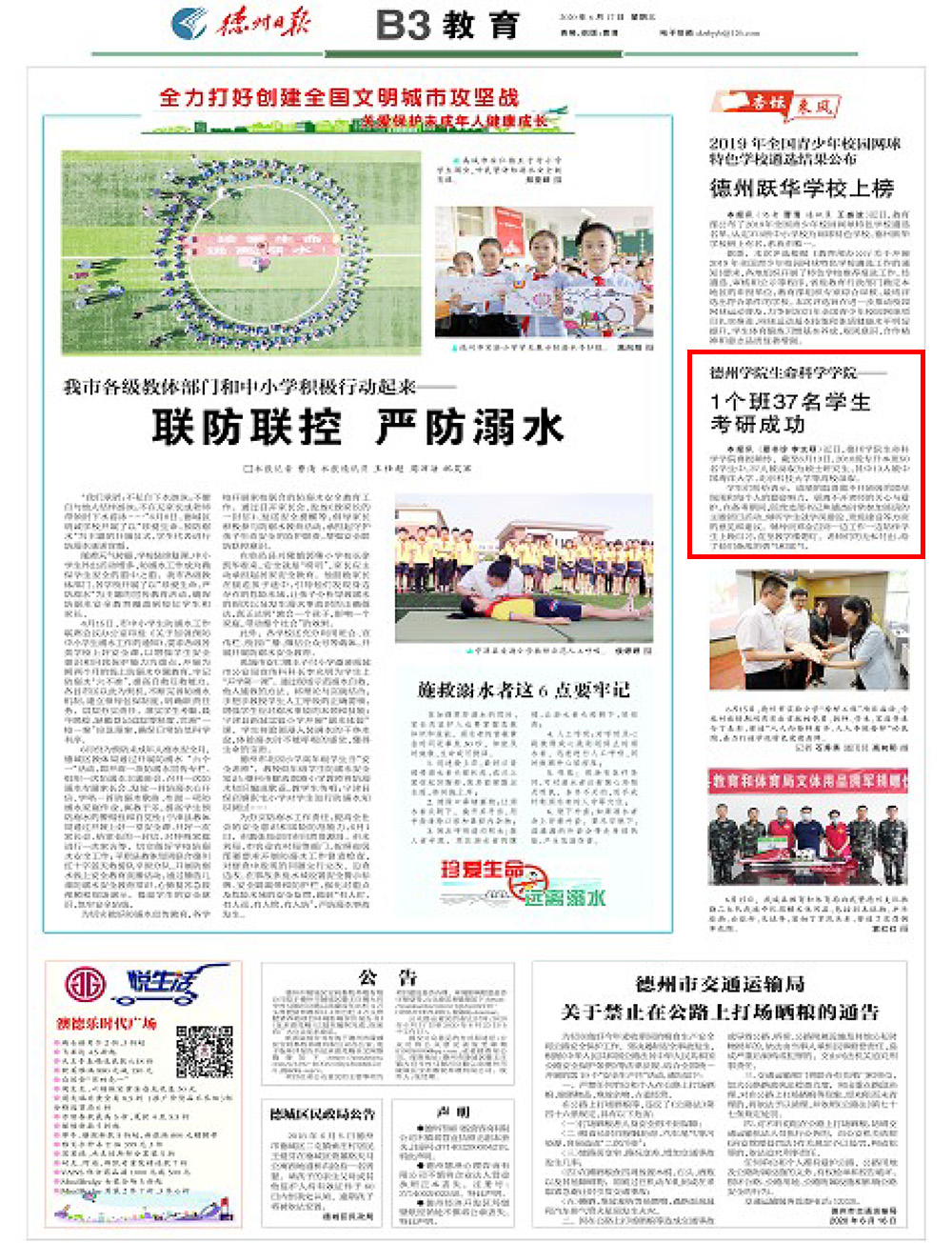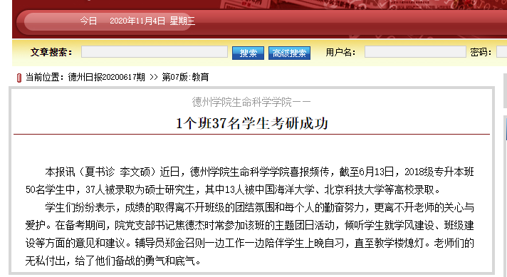 【德州日报】122cc太阳集成生命科学学院——个班37名学生考研成功
