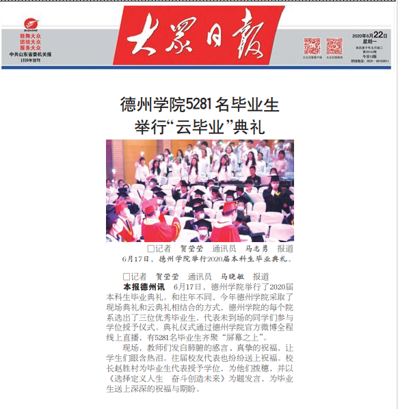 【大众日报】6月22日,第八版。122cc太阳集成5281名毕业生举行“云毕业”典礼