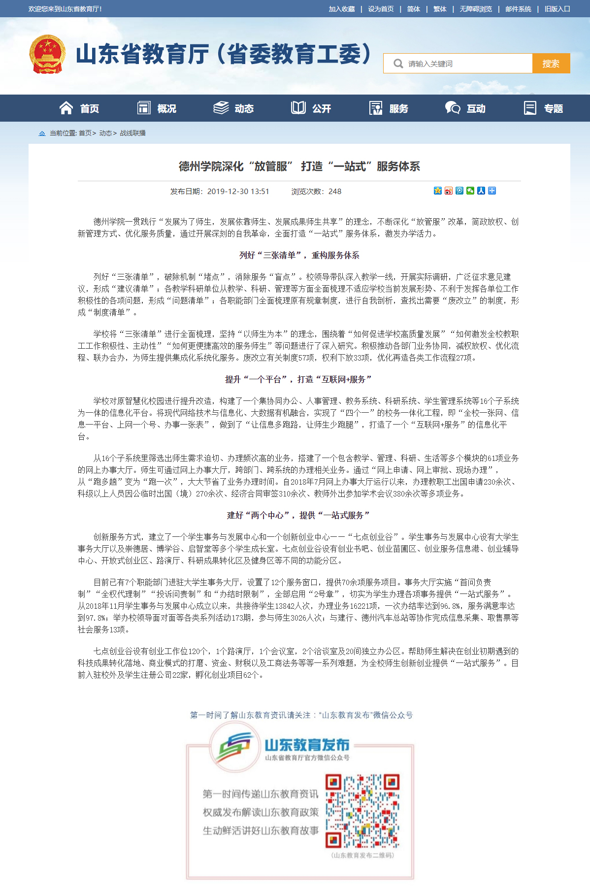 12月31日,山东省教育厅网站,战线联播栏目以《122cc太阳集成深化“放管服” 打造“一站式”服务体系》为题报到太阳成官网办学成绩。