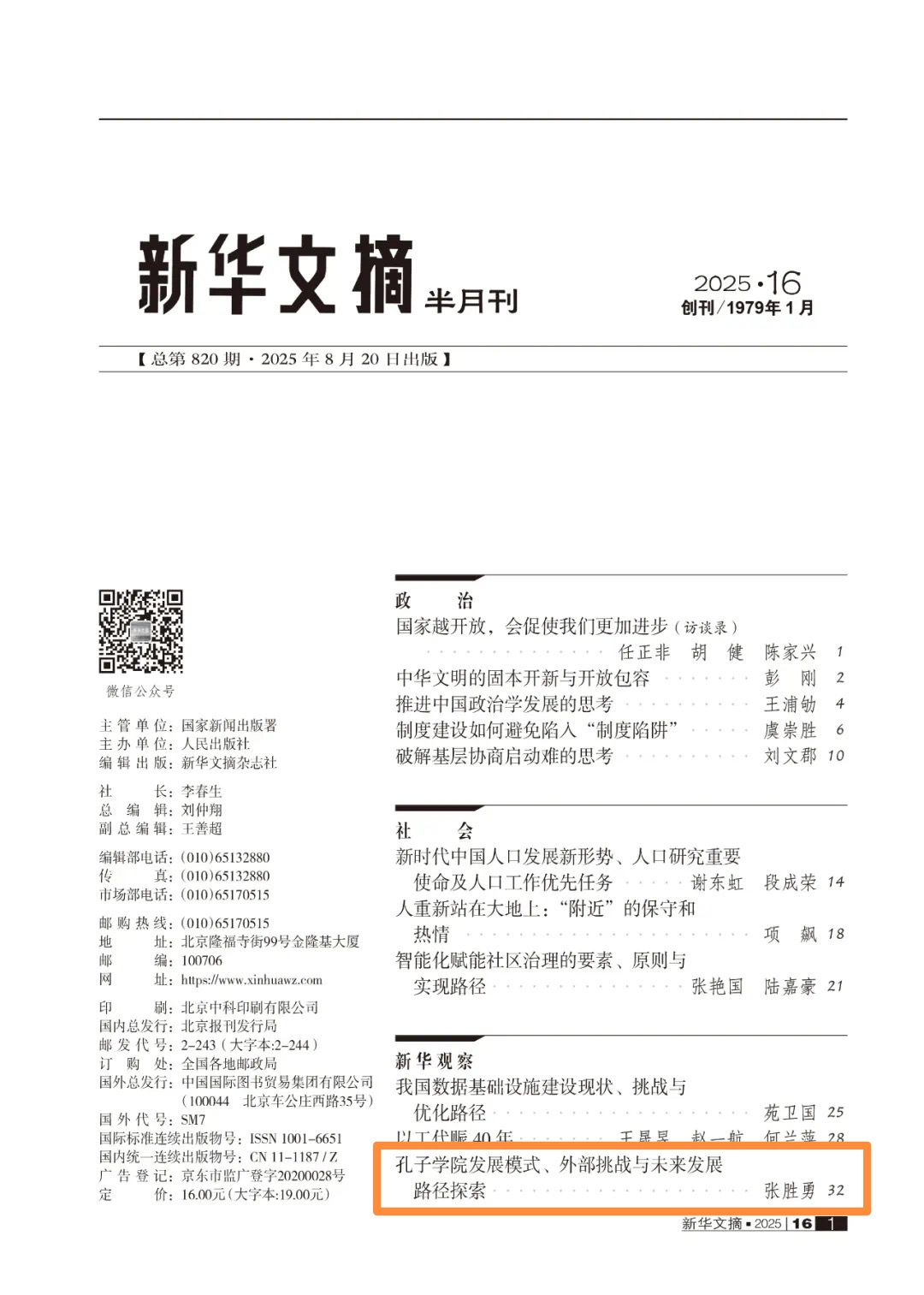 2025年第16期《新华文摘》全文转载122cc太阳集成外国语学院张胜勇副教授撰写的《孔子学院发展模式、外部挑战与未来发展路径探索》一文。该论文原发于CSSCI来源期刊《四川师范大学学报(社会科学版)》。论文从区域国别学视角出发,聚焦孔子学院的现有发展模式,重点分析其协同发展、数字化赋能、特色化发展、海外中文教育体系和标准化建设。论文指出孔子学院面临着复杂的社会环境、负面舆情、人员派出难等挑战,孔子学院应通过扩展“中文+职业技能”影响边界、持续优化生态圈、制定本土化发展策略、发展国别研究和建设高端智库等措施进行积极应对。 《新华文摘》由国家新闻出版署主管、人民出版社主办,是大型理论性、综合性、资料性文摘类权威期刊,是我国学术界公认的权威二次文献之一,具有较高的学术地位和广泛的影响力。能被其全文转载的文章,通常被认为是该学科领域的重要成果,其学术价值等同于在顶级期刊发表的论文。